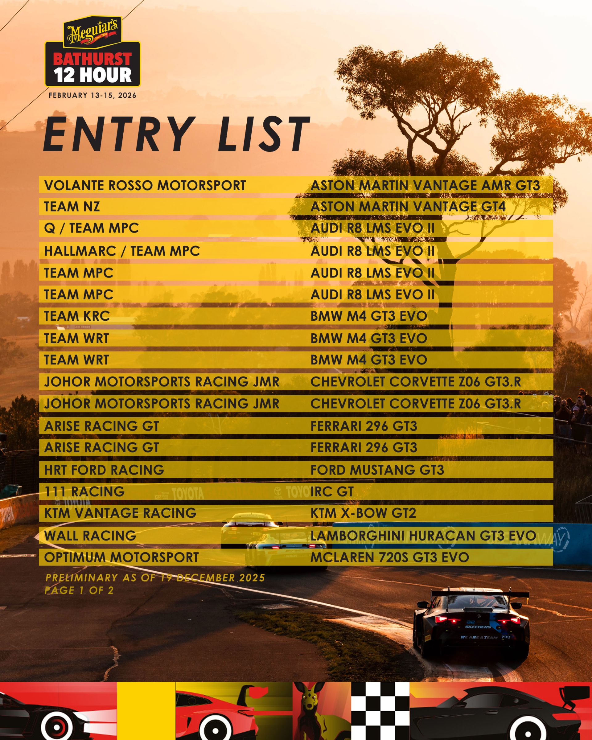 Na Mount Panorama budú súťažiť autá značiek Aston Martin, Audi, BMW, Chevrolet, Ferrari, Ford, IRC, KTM, Lamborghini, McLaren, Mercedes-AMG a Porsche. Doteraz je potvrdených 36 vozidiel GT a do uzávierky prihlášok – 5. januára 2026 sa očakávajú ďalšie.