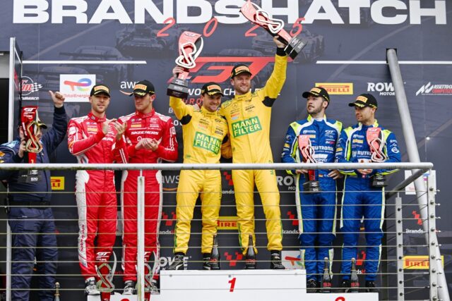 Louis Delétraz priviezol do cieľa svoju „Spike Orecu“ tímu AO Racing na treťom mieste, ktoré oslávili členovia tímu PJ Hyett a Dane Cameron.